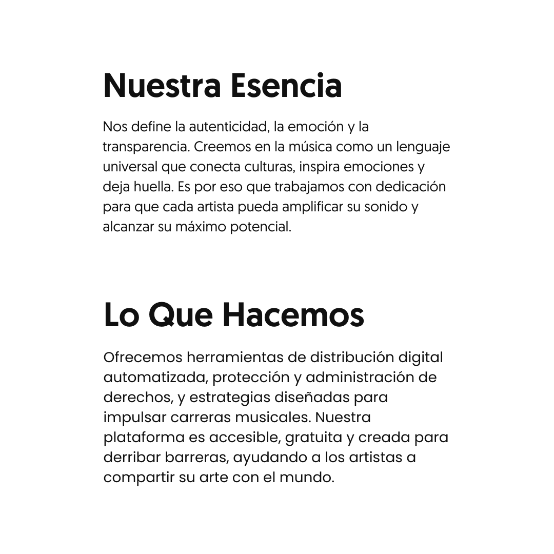 Ofrecemos herramientas de distribución digital automatizada, protección y administración de derechos, y estrategias diseñadas para impulsar carreras musicales. Nuestra plataforma es accesible, gratuita y creada para derribar barreras, ayudando a los artistas a compartir su arte con el mundo.